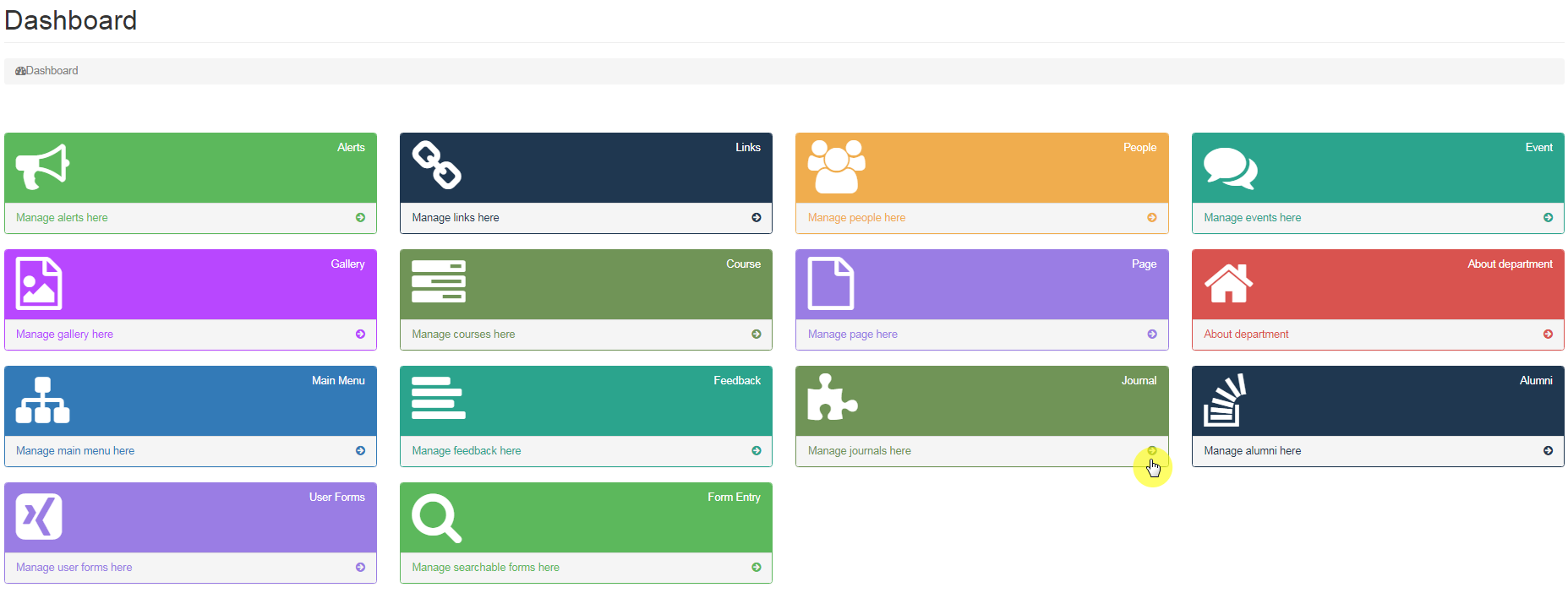 This part of the content Management System helps you to add and update information related to journals Published by the department.