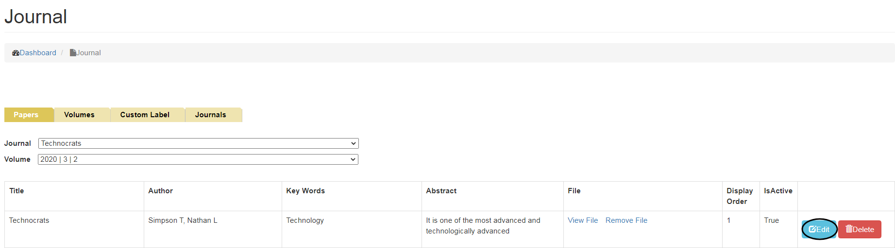 Next step is to add Papers, Click on Papers tab and select Journal and Volume from the drop down menu. Enter relevant details and click on Add button.